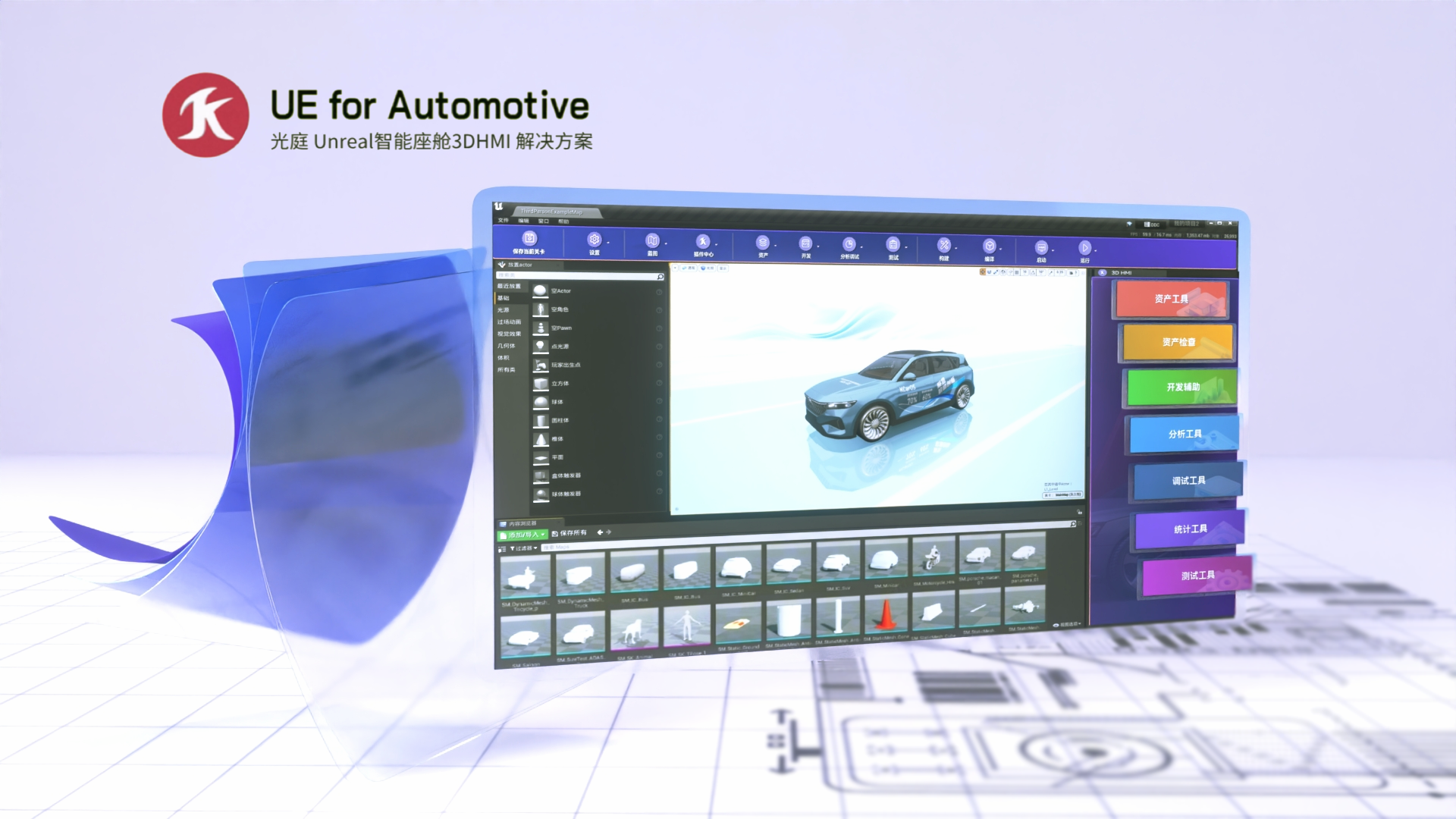 UE for Automotive, powered by Unreal Engine, is a mass-production-ready 3D HMI solution developed by KOTEI. Leveraging the company’s extensive expertise in automotive cockpit software, this solution enhances the 3D experience in intelligent cockpits through its lightweight design, modular structure, customization options, and AI integration.