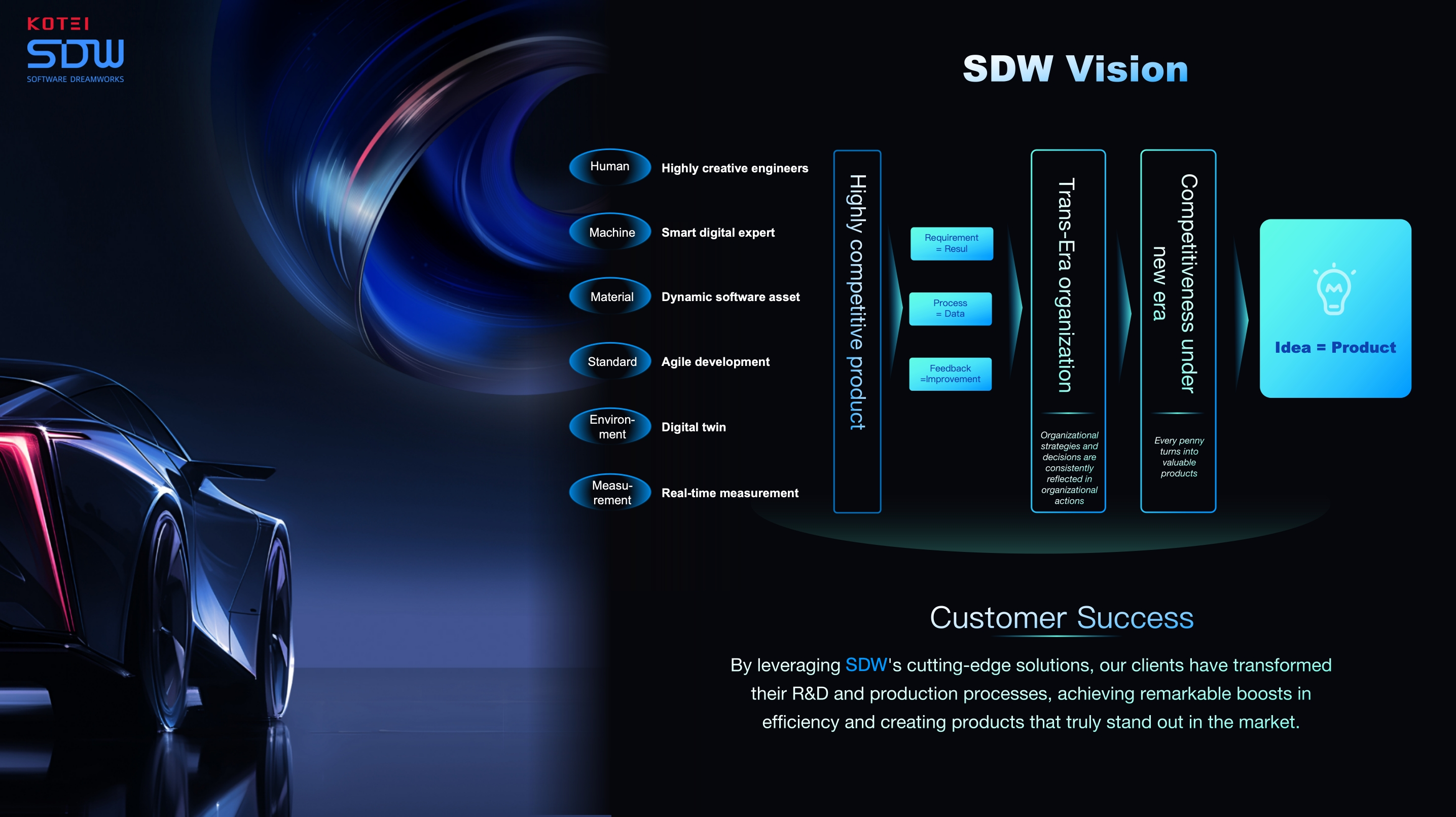As an AI-powered technology leader, KOTEI is committed to delivering advanced productivity tools and operational models to the automotive software industry. From intelligent cockpits to autonomous driving and new energy vehicles, SDW 2.0 positions KOTEI and its clients to seize new opportunities and explore limitless possibilities in the era of smart, connected vehicles.